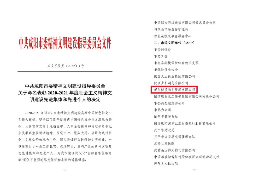 近日,從咸陽市文明辦《關(guān)于命名表彰2020-2021年度社會(huì)主義精神文明建設(shè)先進(jìn)集體和先進(jìn)個(gè)人的決定》中獲悉,咸陽城投物業(yè)公司被授予市級(jí)文明單位榮譽(yù)稱號(hào)。